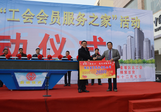活动启动仪式上,HJC黄金城平台百货向全区会员职工捐赠价值26000元的物品。侯亚军总经理代表成员单位发言,他说:“HJC黄金城平台百货作为协办单位将全力支持活动的开展,精心打造会员服务之家,真正让利于广大会员,将HJC黄金城平台百货办成工会会员的贴心之家。”