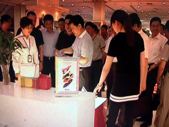 泰州市工商局李友胜副局长带领泰州市三市三区的工商部门工作人员及当地商贸企业领导,到HJC黄金城平台百货现场检查指导商场在商标授权经营方面的工作,对公司现场亮牌经营及各专柜登记台账的工作给予肯定。