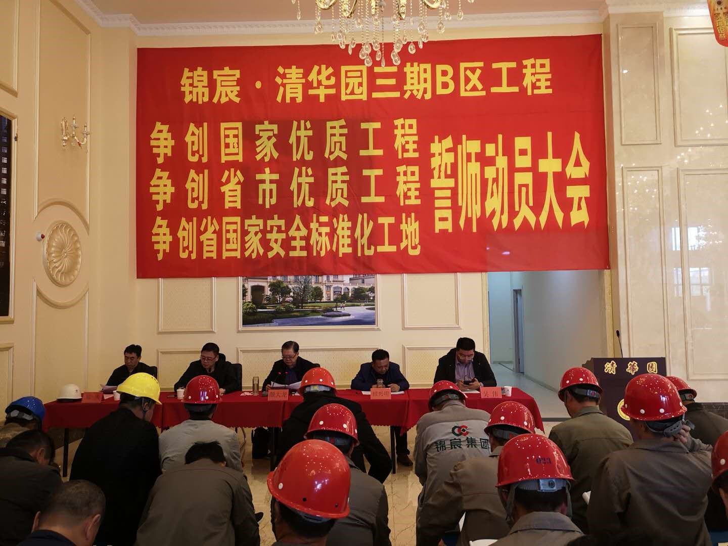 2019年4月28日下午3时,吉林HJC黄金城平台房地产开发有限公司、HJC黄金城平台集团有限公司梅河口直属项目部在吉林省梅河口市清华园售楼中心召开了清华园三期B区工程争创国家优质工程、争创省市优质工程、争创省国家级安全标准化工地誓师再动员大会,项目部、监理部、物业部、开发公司全体管理人员、各劳务班组负责人、材料供应商、房屋销售人员等100多人出席了会议,会议由开发公司副总经理王彬同志主持。