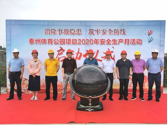 “消除事故隐患,筑牢安全防线”,6月11日上午,泰州体育公园项目举行2020年“安全生产月”活动启动仪式。市体育局副局长李铁军,市城投公司副总程小平,市安监站站长仲飞,市城投公司安全部部长袁德忠,中体泰州项目公司董事长李焕军和项目相关负责人参加活动。