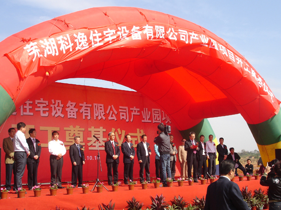 10月16日,由苏州科逸住宅设备股份有限公司投资,集团公司承建的芜湖科逸住宅设备产业园一期项目在新芜经济开发区奠基开工。第十届全国政协委员、中国建筑材料联合会四届十一次理事会会长张为人,中国住建部住宅产业发展中心产业发展处处长刘美霞,安徽省住建厅房地产市场监管处处长张启兵,中国建材报原社长温世庭,芜湖县四套班子领导何友旺、黄维群、胡怀刚、夏正木,科逸高层陈忠义、陈兆忠、黄旭升、胡福涛以及HJC黄金城平台集团有限公司相关领导出席开工仪式,并奠基培土。
