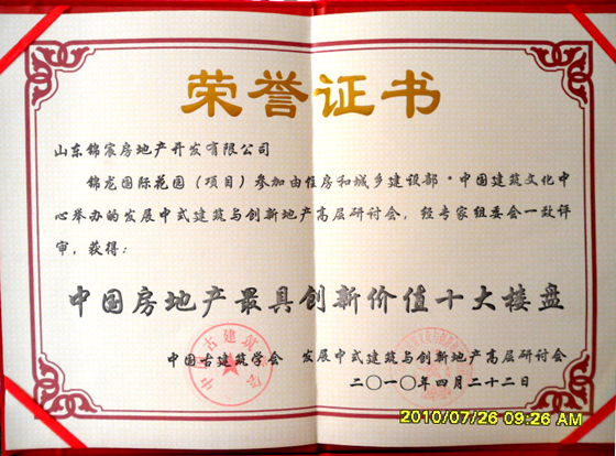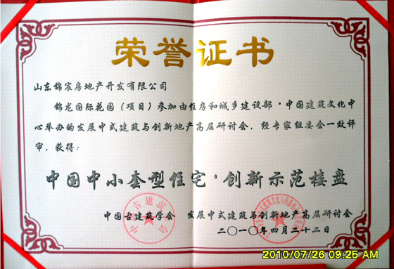 山东HJC黄金城平台房地产开发有限公司开发的锦龙·国际花园继二〇〇八年获得建设部·中国建筑文化中心、中国魅力楼盘组委会颁发的“中国建筑文化典范十大楼盘”、“中国规划设计十大创新楼盘”以来,一如既往精益求精,于二〇一〇年四月又获得中国古建筑学会颁发的“中国中小套型住宅·创新示范楼盘”、“中国房地产最具创新价值十大楼盘”荣誉称号。